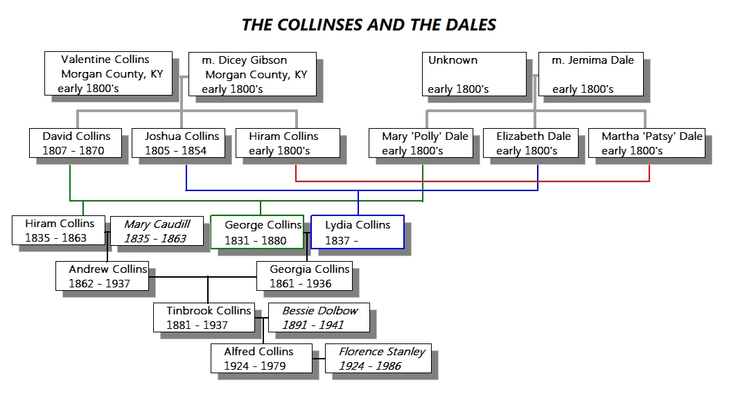 Georgia Ann Collinsb. 16-Feb-1861 Johnson Co., d. 12 Feb 1936 Lewis Co. m. Andrew Collins (first cousin - see above)The colored lines in the family tree diagram below are just to bring clarity to the picture, and have nothing to do with the colored bullets in the text listing above.